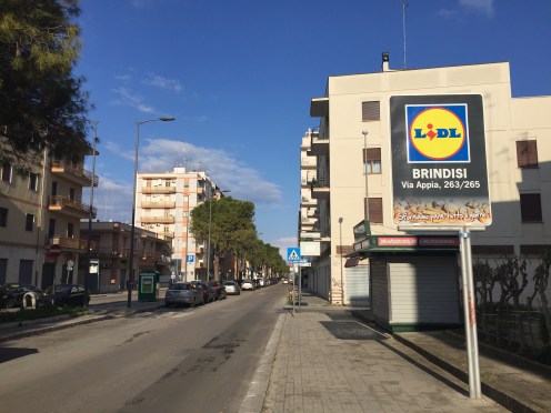 Arrivée à Brindisi, le bus nous pose à l’entrée de la ville, c’est désert. Ça change de la foule d’hier, nous ne sommes pas dépaysés par les publicités de supermarché !!!