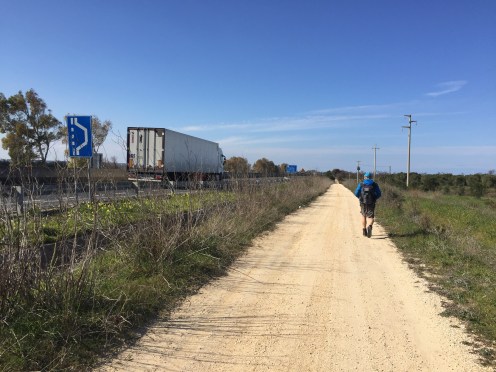 Nous voilà enfin sur un chemin, nous devons être au moins au 15ème kilomètre, seulement il est au bord de l’autoroute !!!