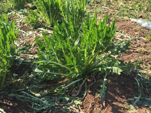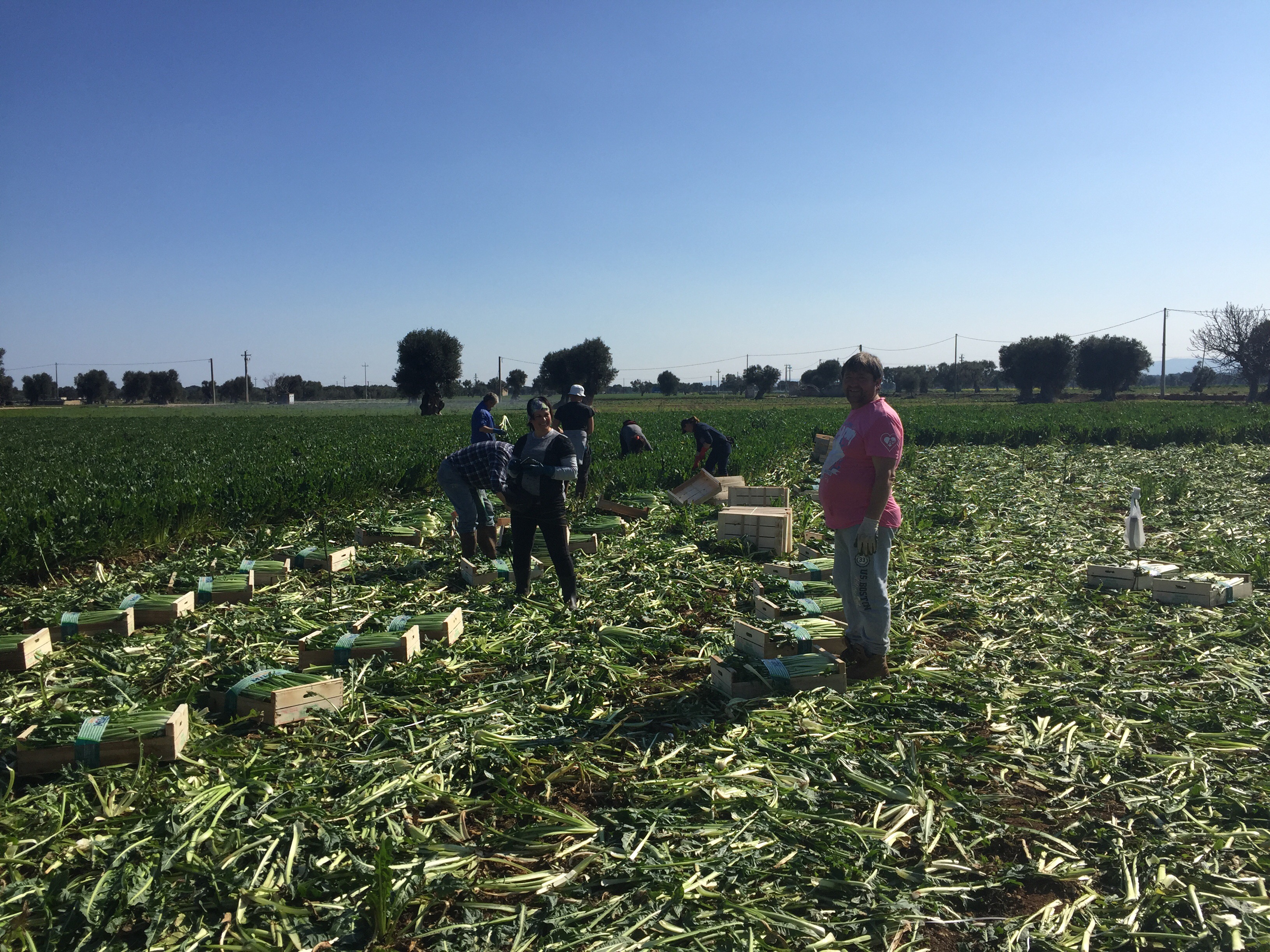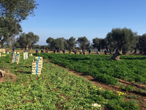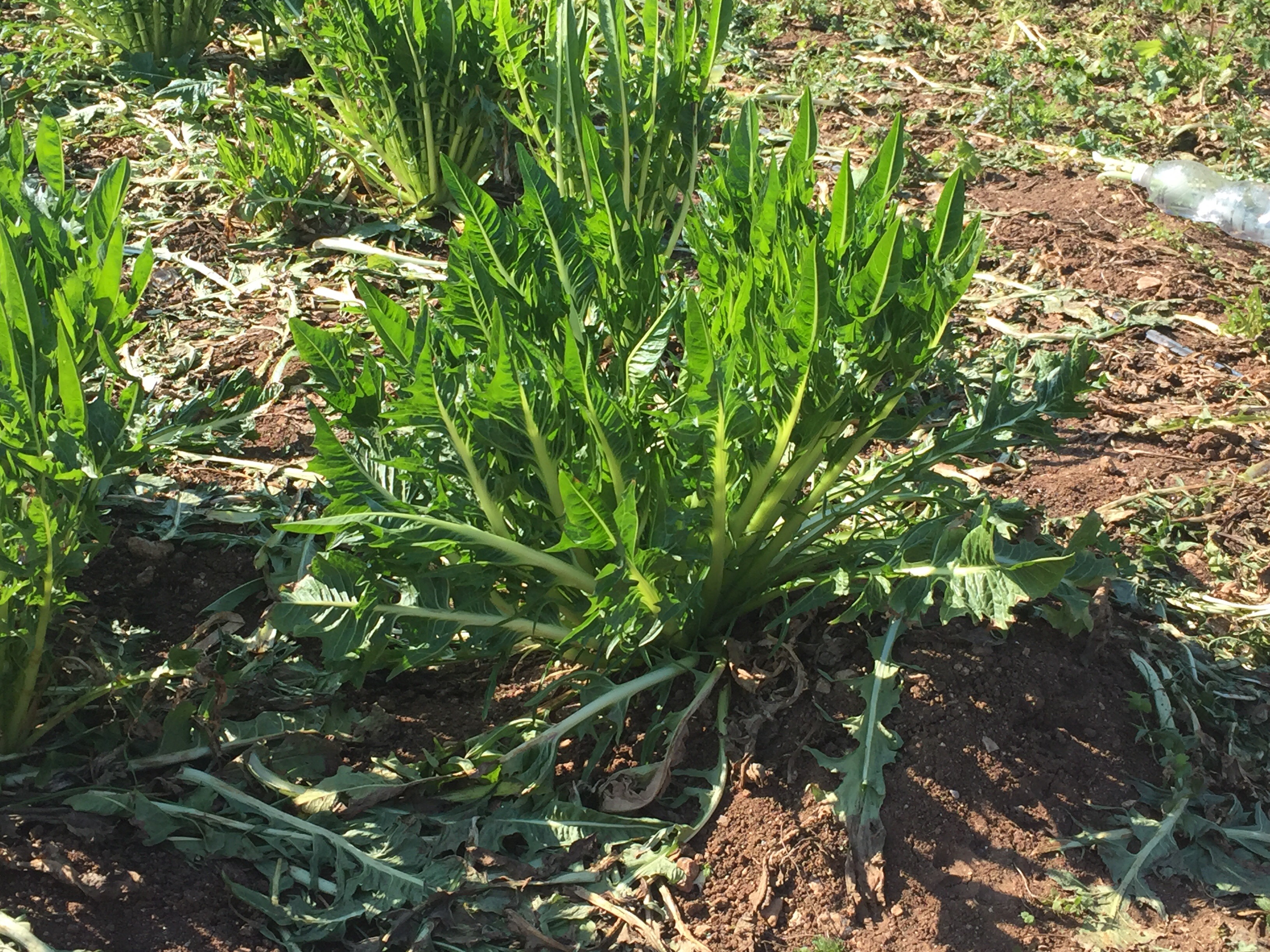 Les ouvriers (6 Albanais, 1 Italien) qui en ramassent, nous font signe de venir. C’est la chicorée de Catalogne.