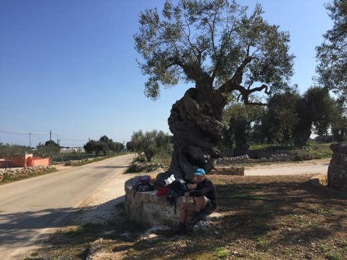 Aujourd’hui pique-nique sous un olivier. Le sandwich acheté ce matin dans une épicerie est délicieux.