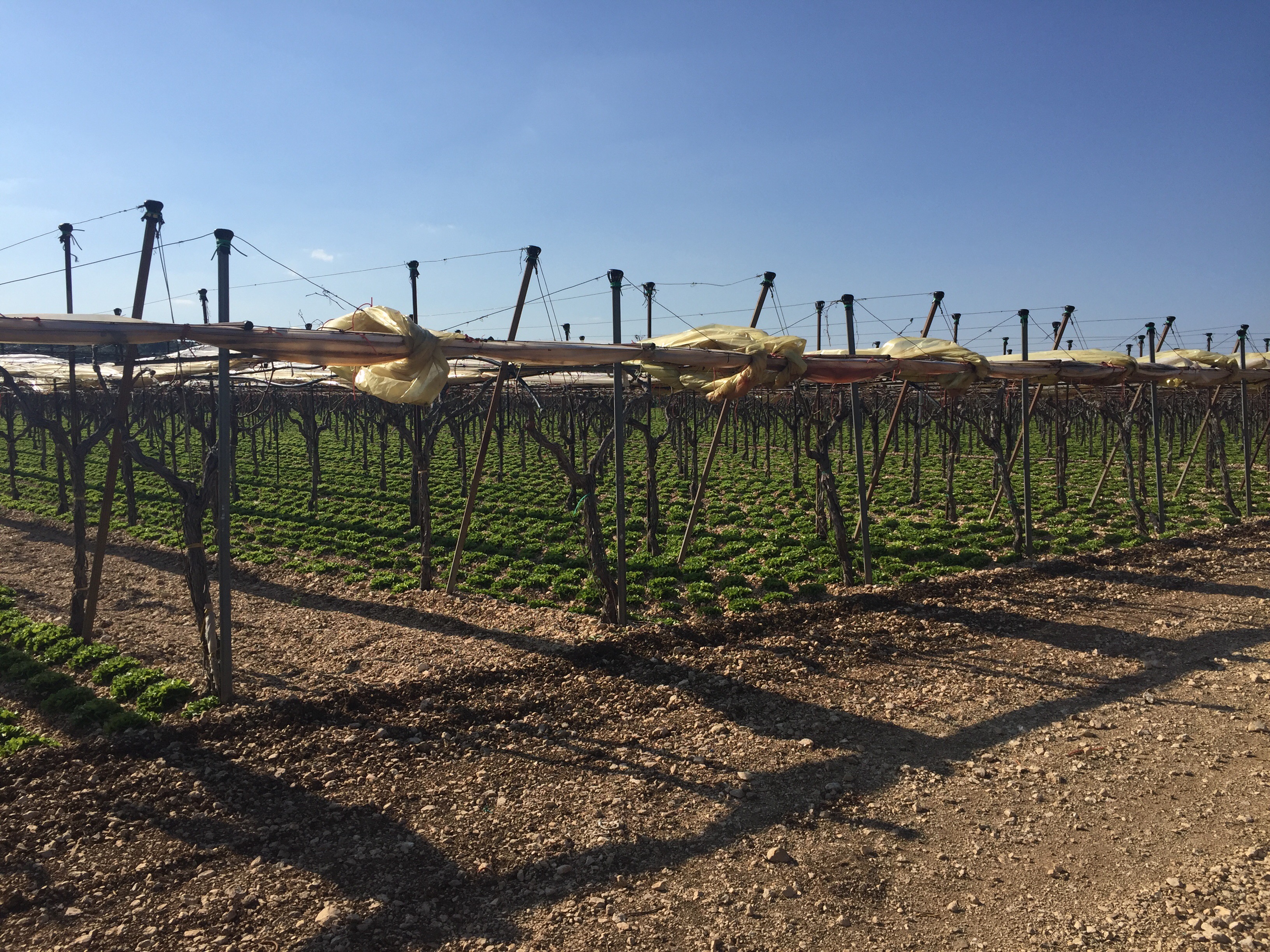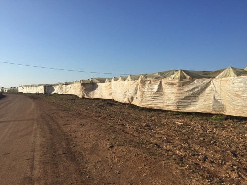 Cette fois ci, en plus du plastique que nous voyons au-dessus depuis un moment, les vignes sont entourées. Nous pensons que c’est du raisin de table.