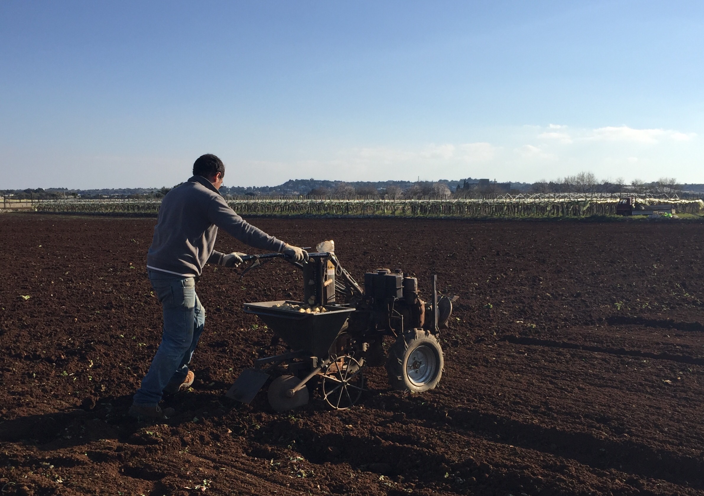Il est en train de planter des pommes de terre. Ce qui est étrange c’est qu’elles ne sont pas entières !!!