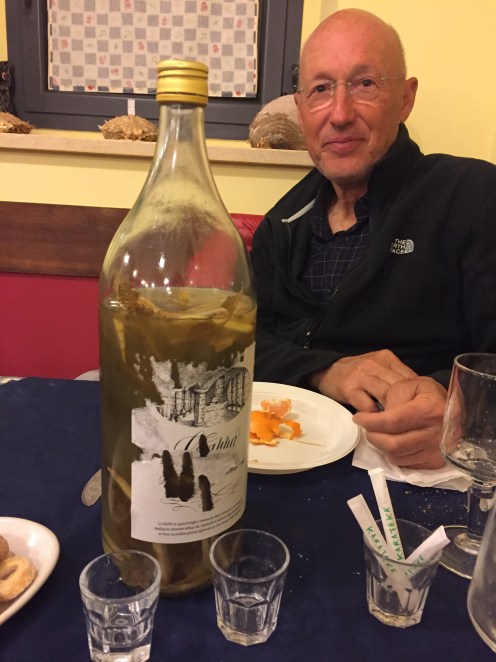 Comme presque chaque fois on nous a offert le limoncello. Mais cette fois on nous a posé l’enorme bouteille devant nous et a nous de nous servir.