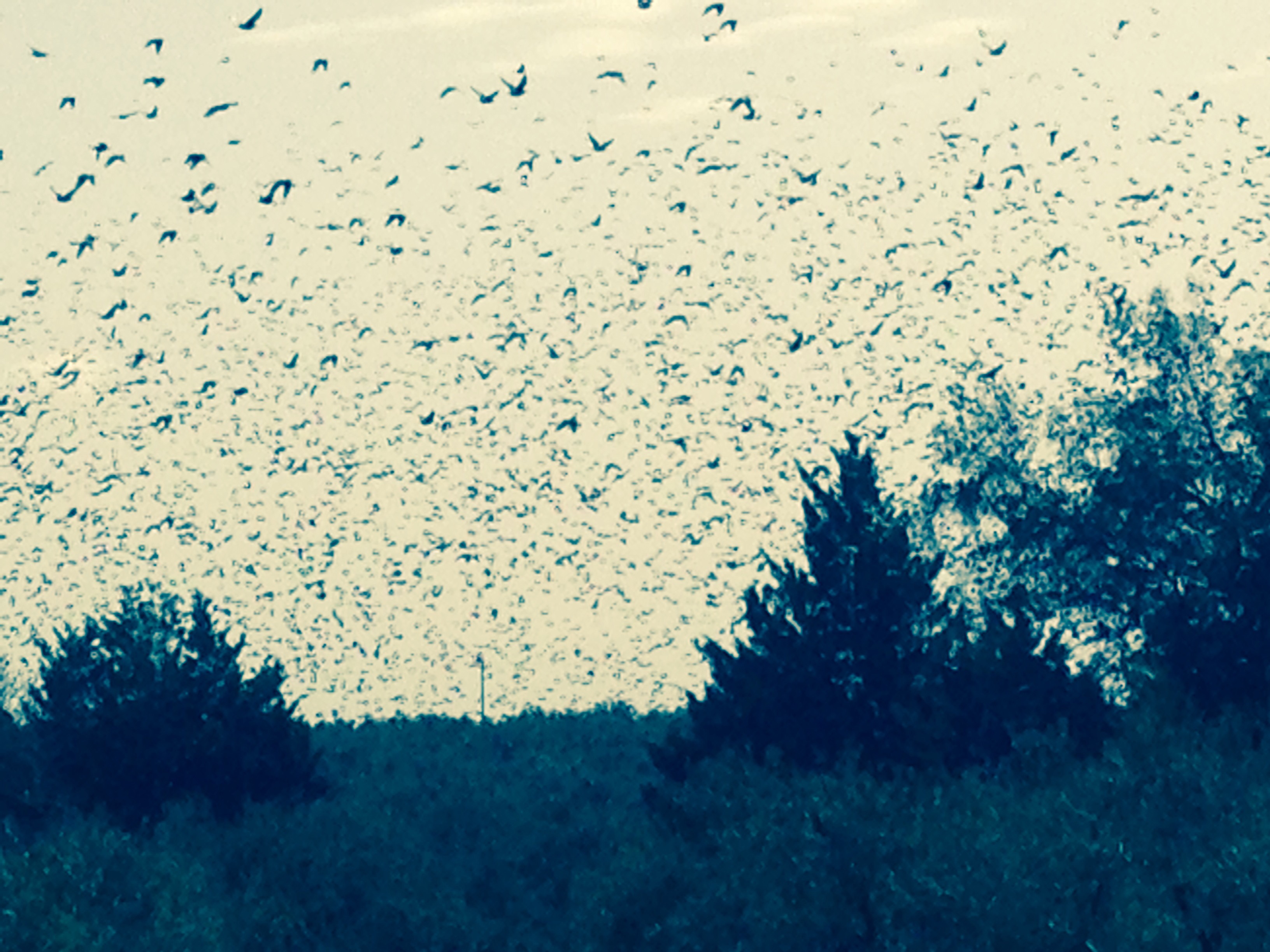 Puis des milliers d’étourneaux s’envolent (un instantané qui ne représente pas la réalité).
