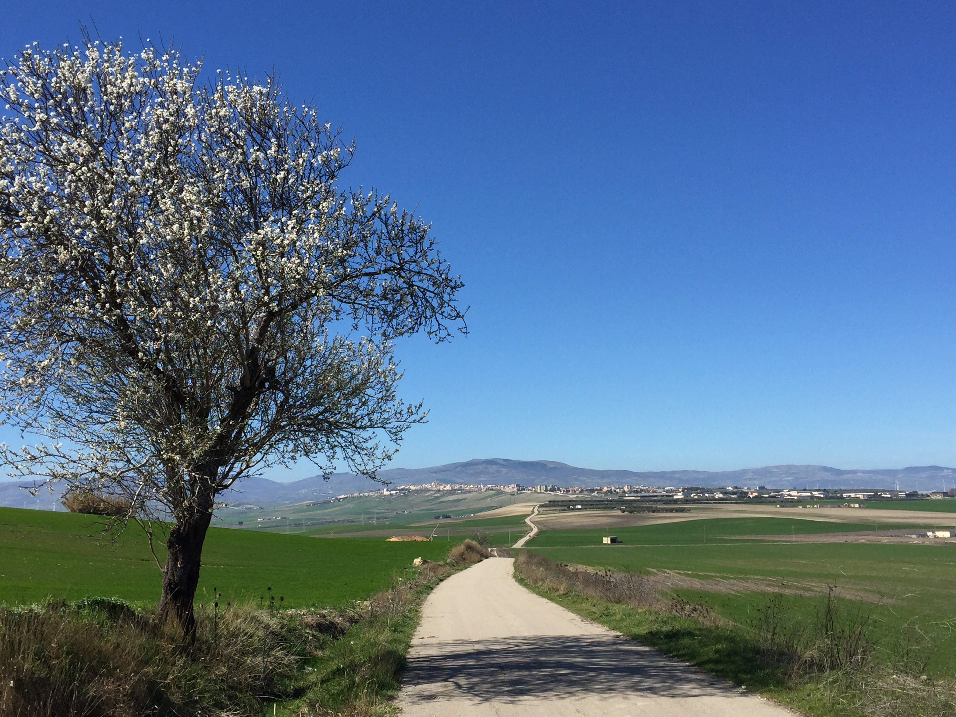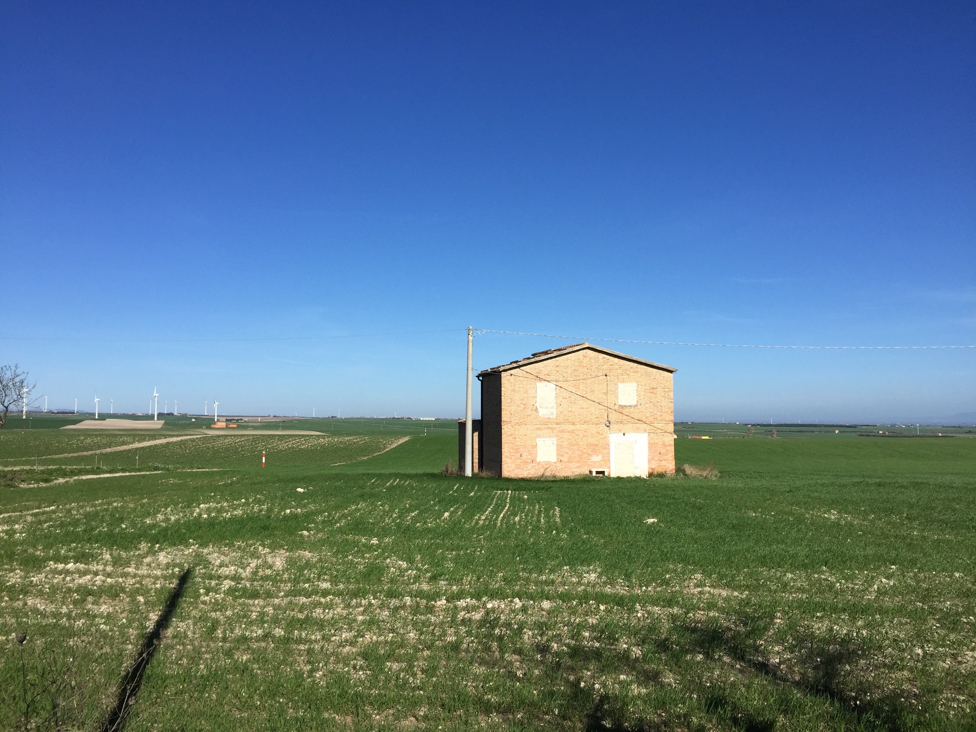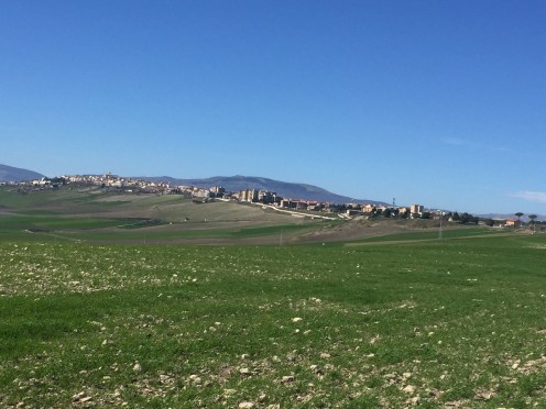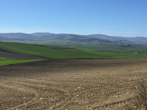 Au loin Troia. Enfin nous avons changé de paysage, c’est vallonné, nous avons des vues lointaines, les chemins sont très peu fréquentés. Nous marchons au milieu des céréales.