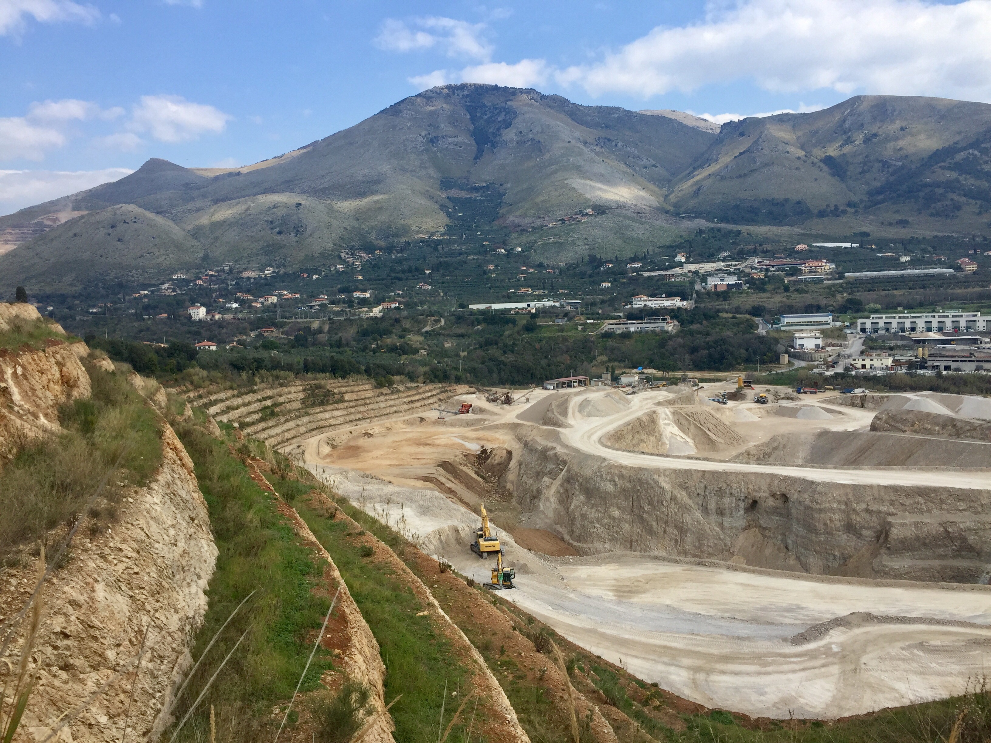 Un peu plus haut, une autre carrière. Le tractopelle est sur un des chemins du haut et pousse les cailloux dans le vide aux endroits où on voit des traces de descente.