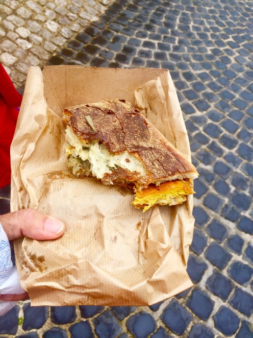 Mon panino chaud mangé en marchant. Un pain craquant à souhait avec une omelette aux artichauts. Un délice !!!
