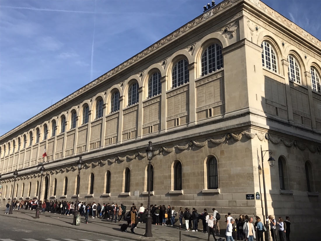 Queue des étudiants pour rentrer dans la bibliothèque Sainte-Geneviève.