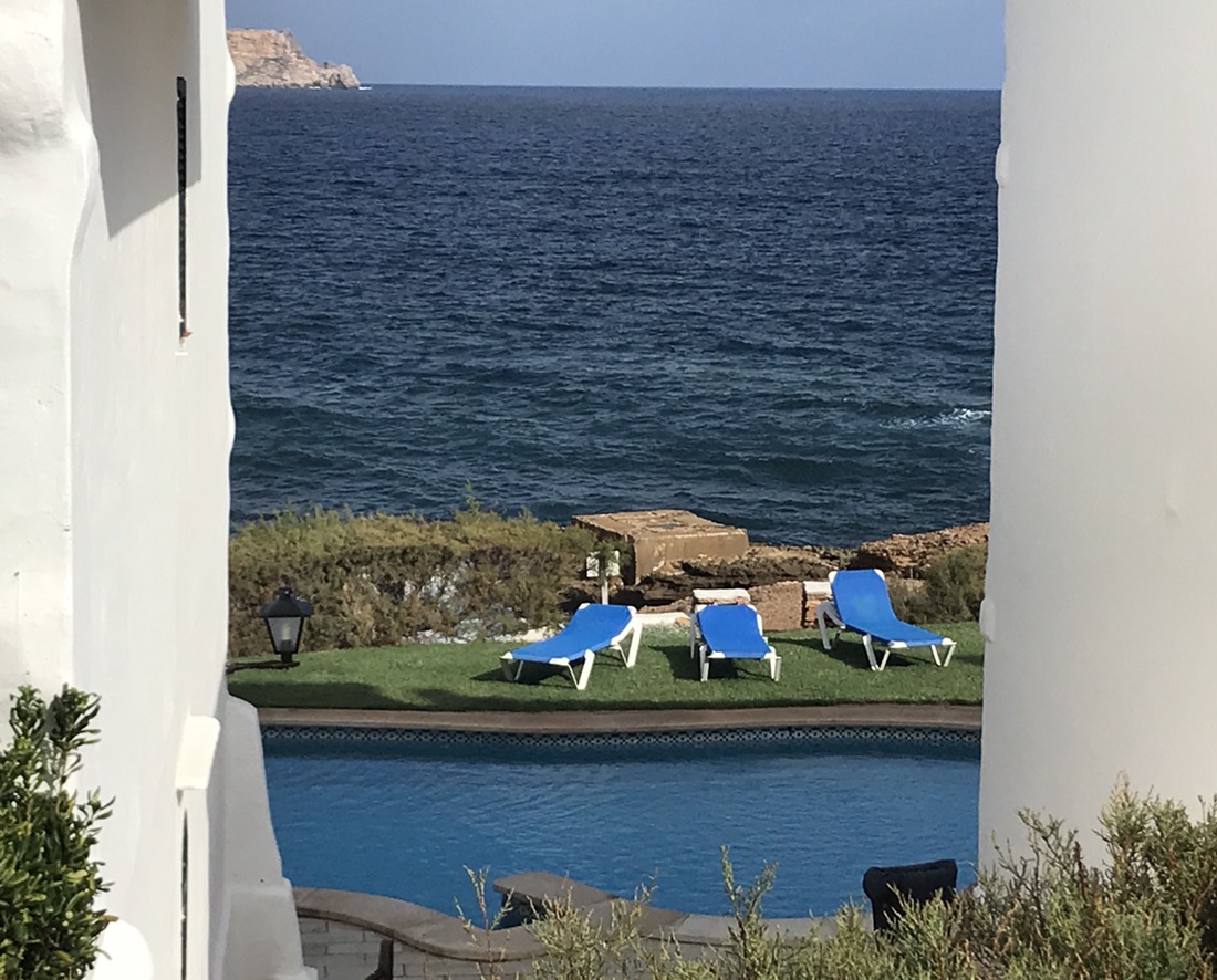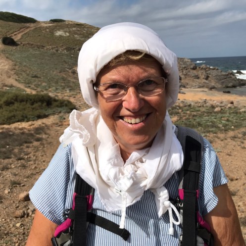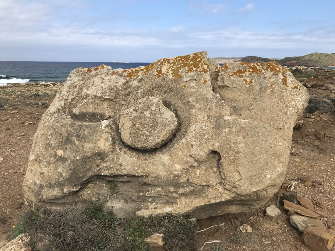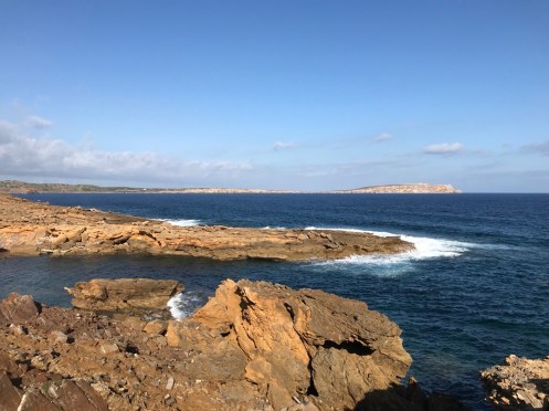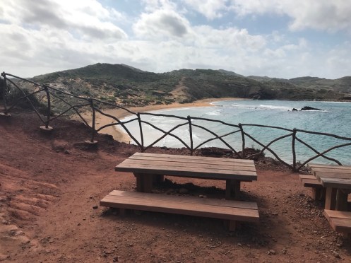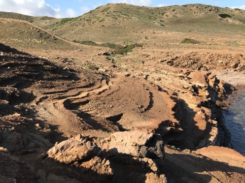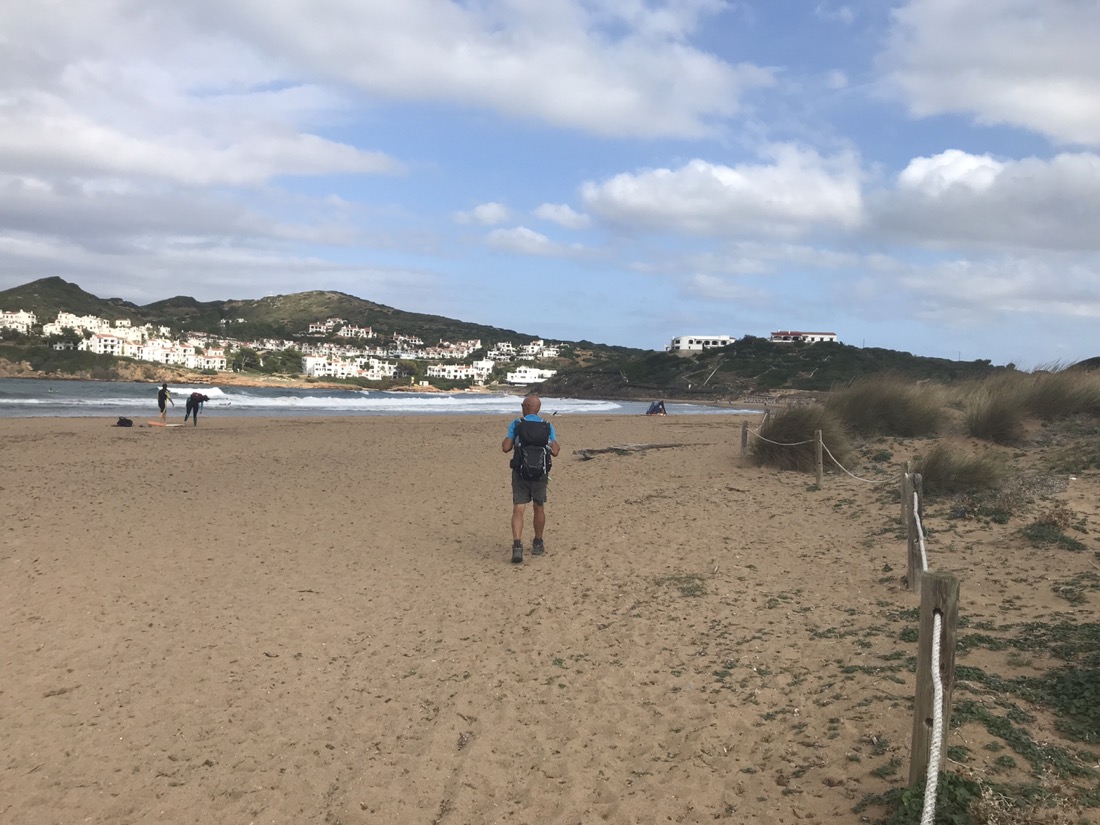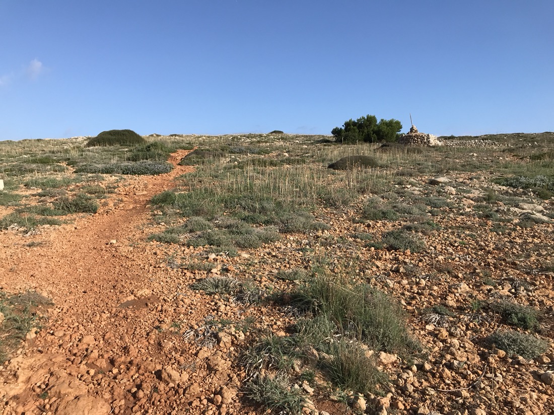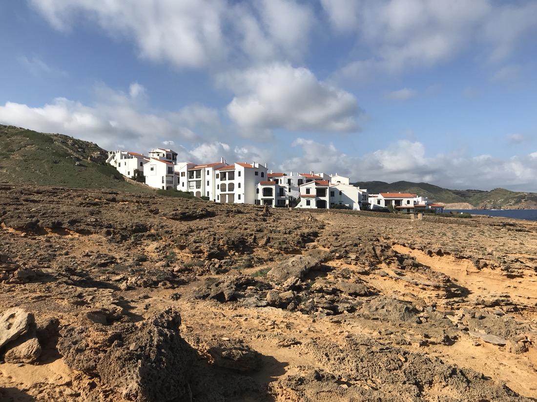 En fait nous sommes dans notre appartement vers 11h, nous changeons un peu nos plans, nous faisons appeler un taxi qui nous mène à Binimel.là (un tiers de la longue étape) et nous revenons vers Cala Tirant. Demain nous reprendrons un taxi jusqu’à Binimel.là et nous continuerons l’étape jusqu’à Cala Morell où on trouve de l’hébergement, nous n’aurons plus que 20 et quelques kilomètres à faire. C’est jour de fête, nous pouvons alléger notre sac avant de partir !!! Je ne garde que mon coupe vent, ma polaire et la cape de pluie car le ciel est gris. On ne sait jamais !!! Bien sûr le soleil se lève, il fait très chaud et la seule chose que j’ai oubliée c’est ma casquette !!!
