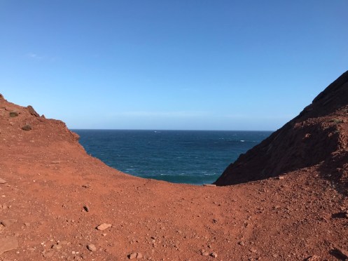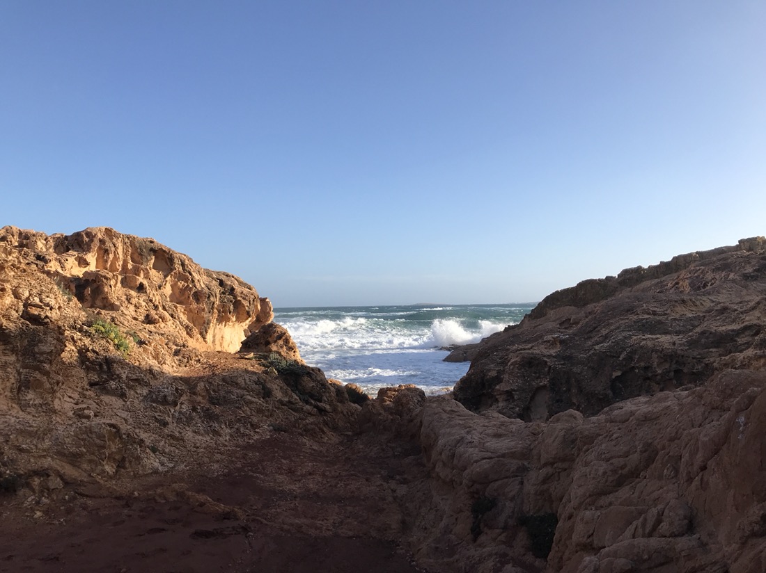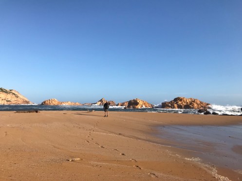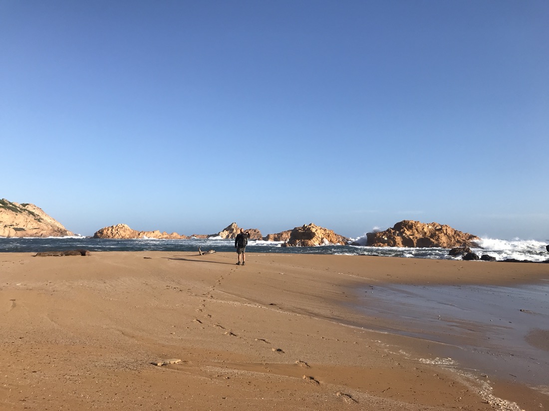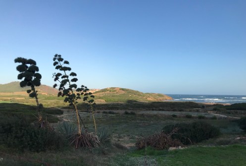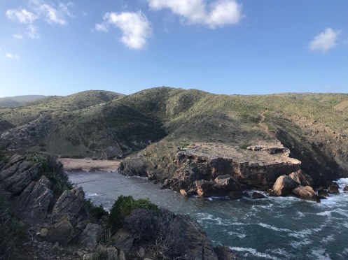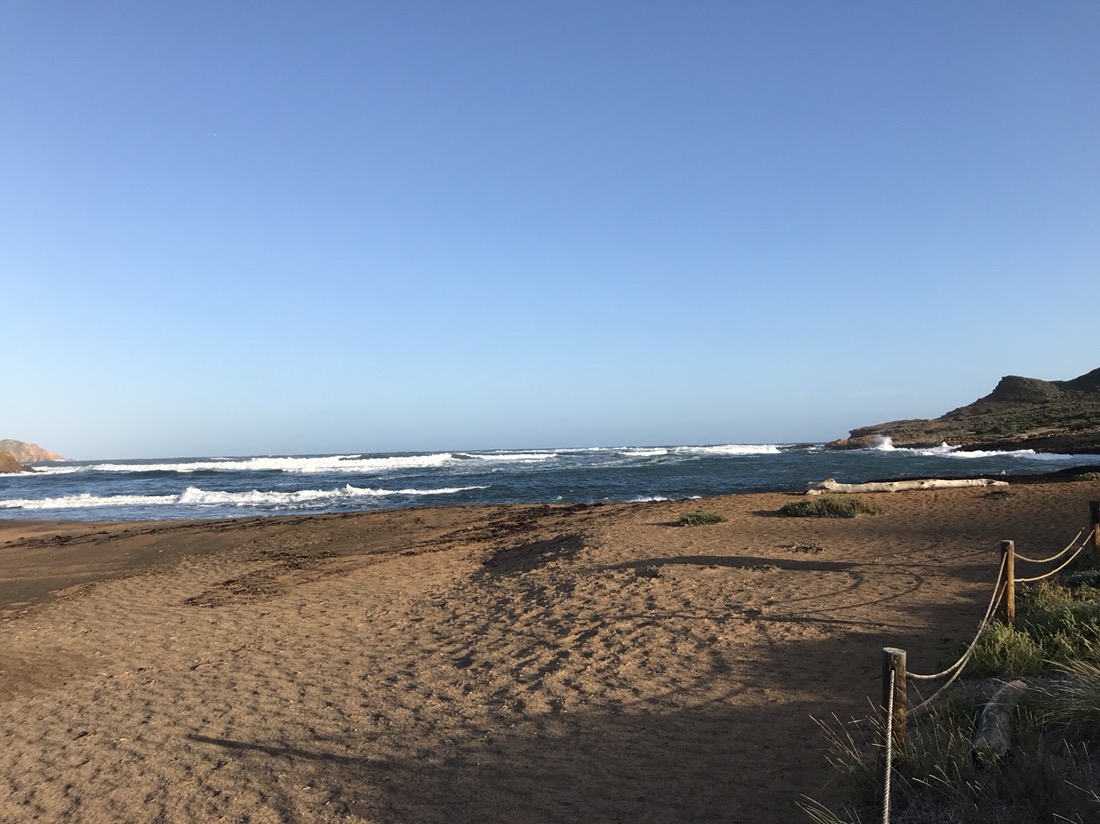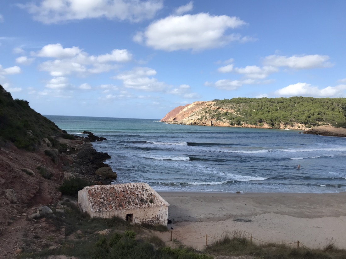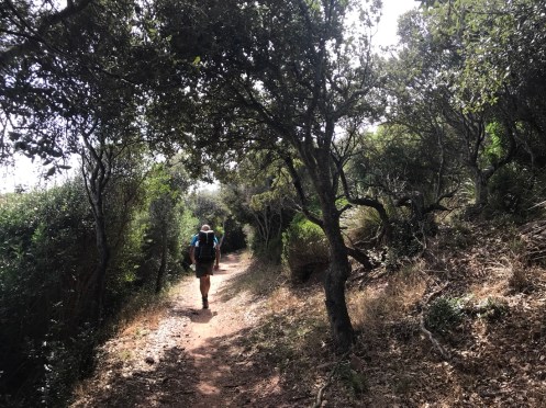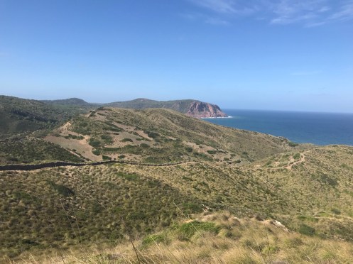Fin de la première partie, la plus vallonnée, celle où nous aurions pu nous faire rapatrier si nous n’étions pas partis de Binimel.lá. Il y a un parking à proximité et l’accès à la plage montre qu’il doit y avoir du monde en été.