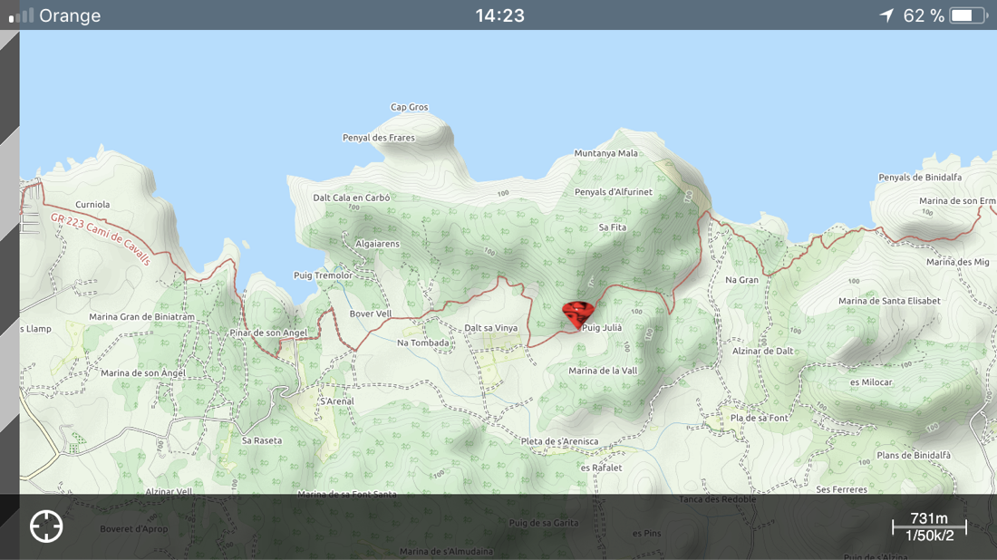 Notre trajet est matérialisé par un trait rouge. La toupie rouge c’est notre position. Nous sommes à l’intérieur des terres et c’est agréable aussi.