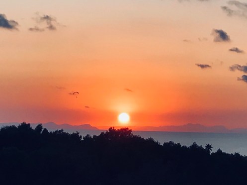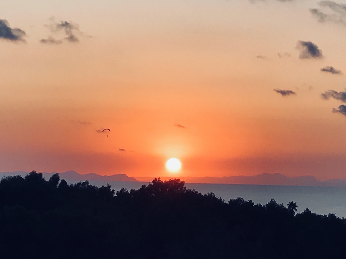 Hier soir nous avons assisté à un magnifique spectacle. Au moment du coucher du soleil les côtes de Majorque, que nous apercevions très difficilement depuis que nous sommes sur la côte sud, se sont retrouvées éclairées par le soleil et on aurait dit qu’elles étaient devant nous. Sur la photo on voit le relief mais ce n’est pas aussi beau que ce que nous avons vu.