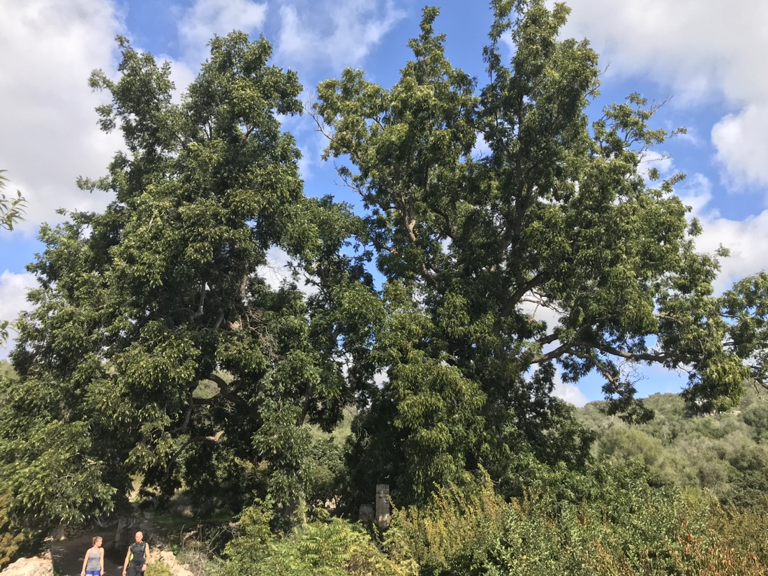 Ces deux arbres immenses, des pacaniers (noix de pécan) sont inscrits au catalogue des arbres singuliers des îles Baléares. La photo ne montre pas leur taille, ils ont été ramenés d’Amerique par des émigrants minorquins à leur retour sur l’île.