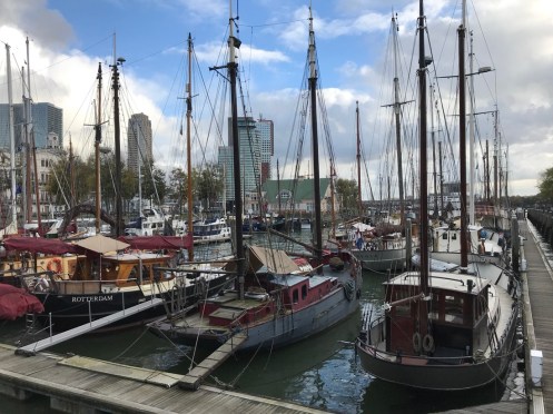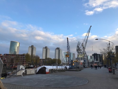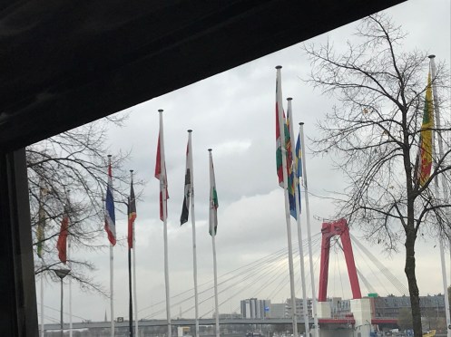 Tour de la ville dans un promène couillons. Oh, que je suis vulgaire !!! C’est bien pratique de prendre ce genre de bus pour voir l’essentiel d’une ville. La saison étant bien avancée c’était juste un petit bus qui ne s’arrêtait pas pour nous laisser descendre et remonter plus tard. Drapeaux le long des quais de la nouvelle Meuse. Ils représentent les différentes nationalités présentes à Rotterdam. Il y en a 175 !!!