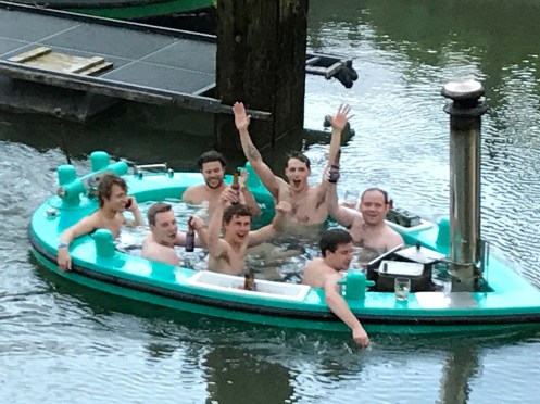 Ça y est nous avons enfin rencontré le Jacuzzi qui nous intriguait au pied du bateau rouge. En fait c’est un bateau baignoire chauffé !!!