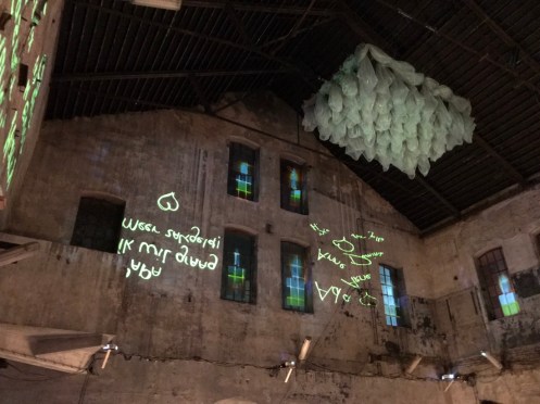 Dans une sorte de hangar, ce qui était écrit sur les murs se reflétait au sol sur un plan d’eau et on pouvait lire à l’endroit ce qui était écrit.
