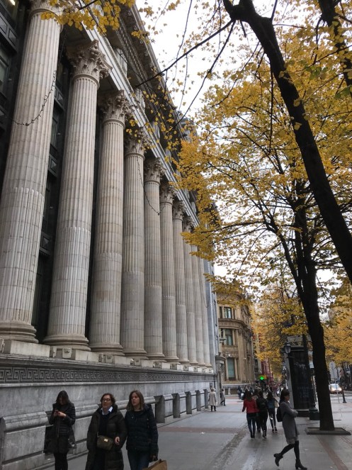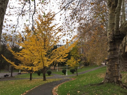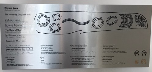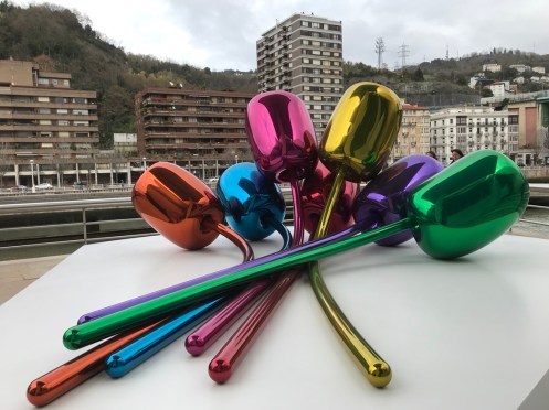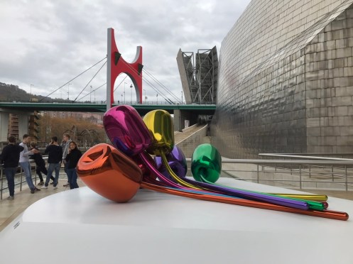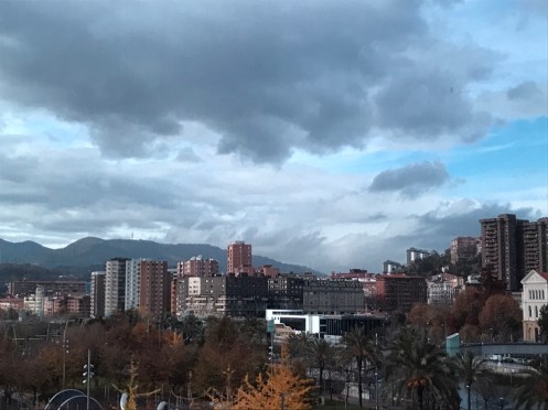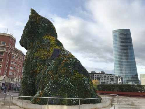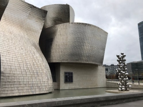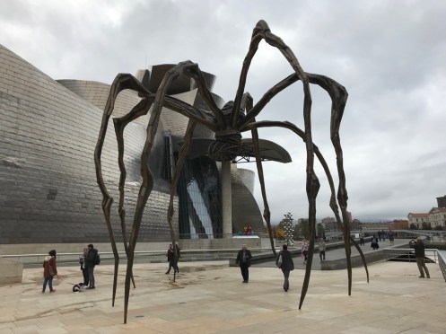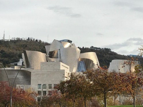 Autoroute jusqu’à Bilbao bien sinueuse. Nature magnifique, de très belles couleurs d’automne et de la verdure. Il est bien là mon Musée adoré !!! C’est la troisième fois que je vais le voir et je ne me lasse pas d’admirer l’œuvre de Frank Gehry. La première fois en 1998, un an après son ouverture j’ai pu le voir sous le soleil. Très important pour les reflets sur sa structure métallique. Des pensées de toutes les couleurs. Les photos sont interdites !!! C’est une des œuvres qui m’a le plus émue… Terre des deux fleuves d’Anselm Kiefer. Il faut le voir en réalité. David Hockney, l’exposition du moment. 82 portraits. La matière du temps, de Richard Serra. Grandiose !!! Œuvre commandée spécialement par le musée. En acier patinable, 8 sculptures remplissent la plus grande salle du musée. Hiver. Amie Siegel. Une vidéo avec des images magnifiques, parfois des sons enregistrés, à d’autres moments des sons venant de musiciens ou de bruiteurs présents dans la salle. Nous avons raté une séance avec des musiciens que nous avons vus sortir de la salle et qui n’y sont pas retournés lorsque nous avons regardé le film. Jeff Koons. Tulipes. Anish Kapoor. Louise Bourgeois. Reflets dans une vitre. De la fumée est envoyée de temps en temps pour modifier le paysage !!!Une dernière vue du musée. Promenade dans Bilbao. Retour au parking. Arrivés à San Sebastian nous allons chercher le dossard d’Yves pour le marathon de dimanche. Embouteillages, on passe devant l’endroit sans pouvoir trouver une place pour stationner, heureusement on trouve par hasard un parking pas trop loin.