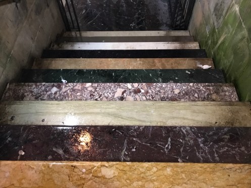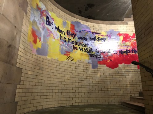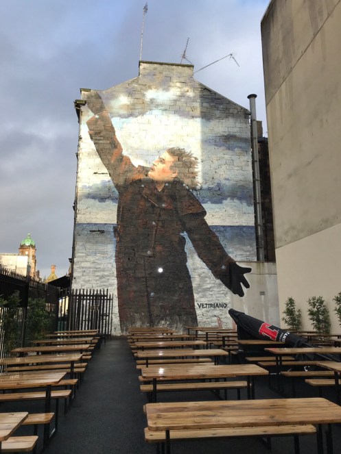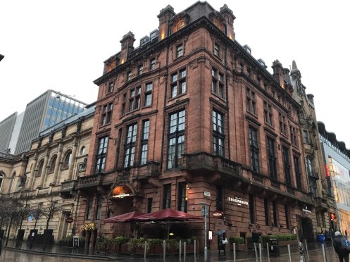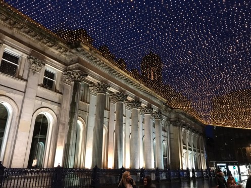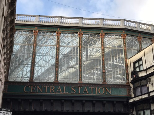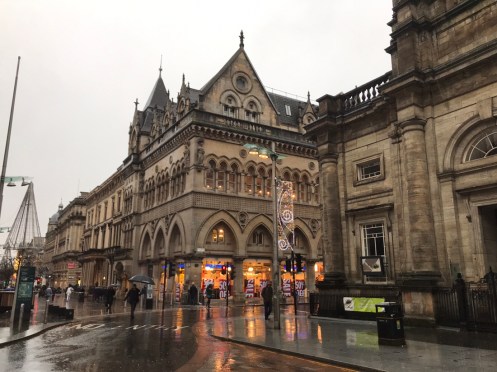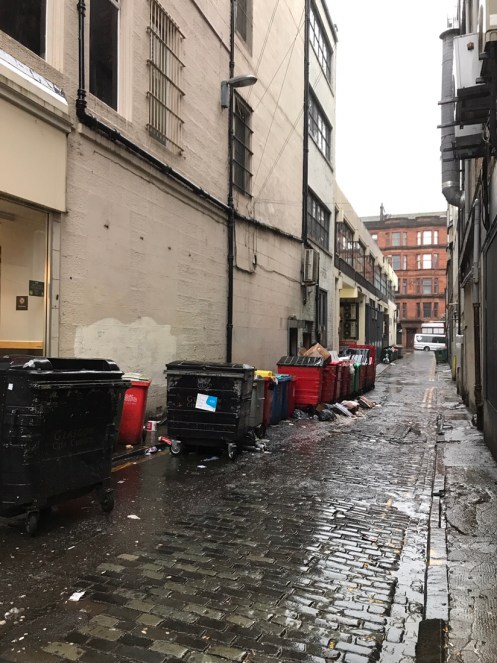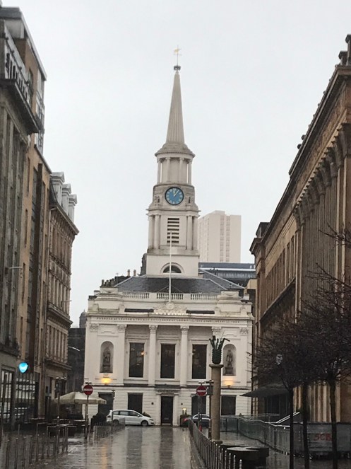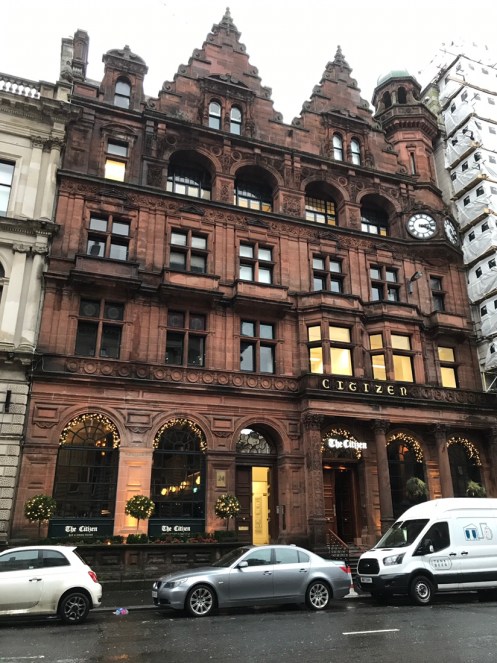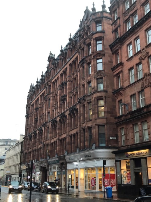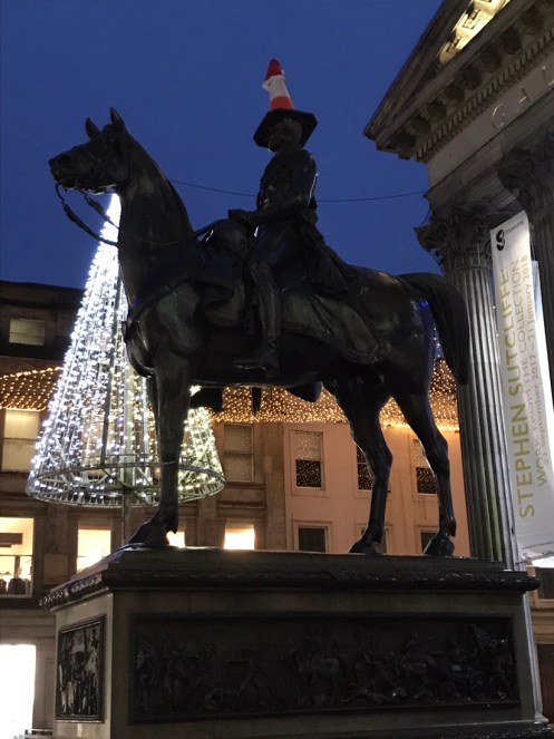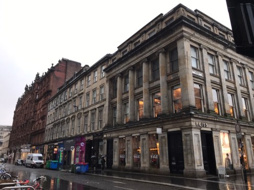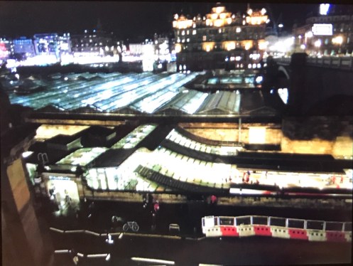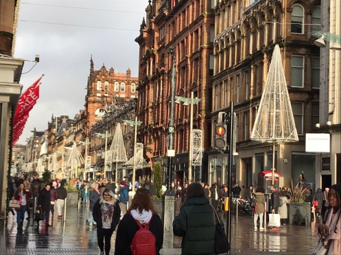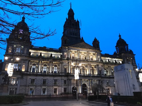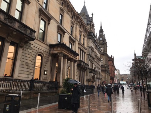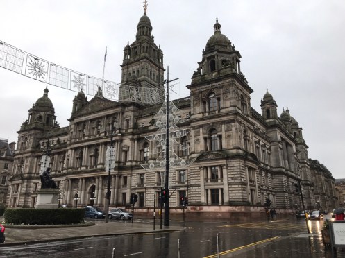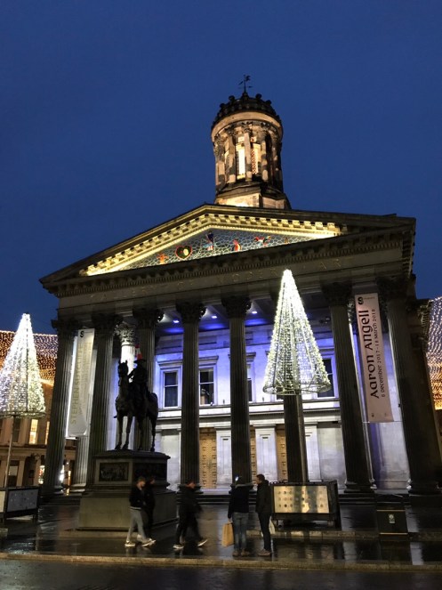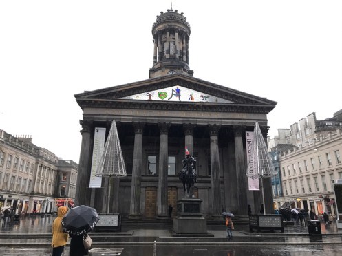 Glasgow Aujourd’hui nous allons visiter Glasgow. Taxi devant la gare d’Edimbourg, ils sont souvent de couleur noire mais il y en a aussi de joliment décorés. Nous avons été prudents, il pleut dès notre sortie de la gare !!!De belles rues, de beaux bâtiments et soudain ceci. En fait les poubelles sont concentrées dans les ruelles. Nous nous promenons dans les rues et faisons des photos. Je ne sais pas souvent le nom des bâtiments. Là, je pense que dans ce bâtiment il y a l’office de tourisme que nous n’avons pas trouvé. À part les boutiques et les rues qui étaient noires de monde tout le reste était fermé. Musées et bâtiments publics. GoMA. Gallery of Modern Art, le jour. La même photo de nuit !!!Vue de côté. On revient aux photos de jour. L’autre gare de Glasgow. Sur les bords de la Clyde. L’hôtel de ville. De l’autre côté de la place où se trouvait l’office de tourisme. Ça a dû être un peu difficile pour monter jusqu’au chapeau !!!L’autre jour c’était Nespresso, aujourd’hui c’est Swatch. Fin des photos de Glasgow. Belle ville. Nous reprenons le train. À peine une heure de trajet. La gare de Waverley se trouve en dessous du pont de North Bridge. Nous devons remonter sur le pont par un escalier, the Scotsman Steps, avec 104 marches en marbre de couleurs différentes de l’artiste Martín Creed.Nous sommes en train de regarder TV5MONDE, une émission sur Gauguin. Il avait offert ce tableau au prêtre de Pont Aven qui l’a refusé, il est maintenant dans la Scottish National Gallery !!! Gauguin est mort dans la misère.