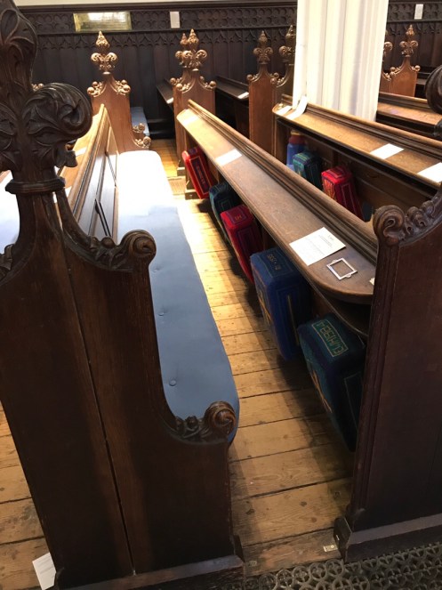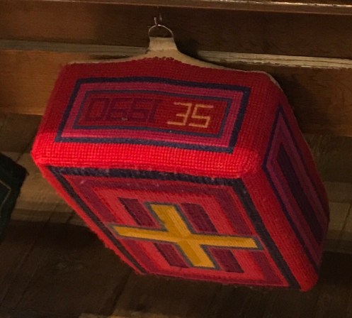 À l’intérieur de l’église St John’s, coussins au point de croix pour s’agenouiller.