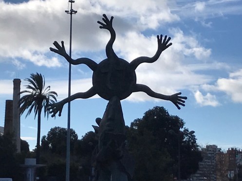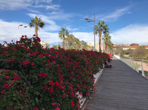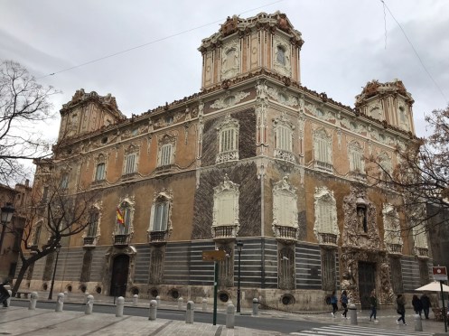 Le musée de la céramique. Un des immeubles les plus curieux de la ville. Il est surchargé de sculptures en albâtre rose. La porte d’entrée. Encore un arbre remarquable !!!Pont piétonnier sur la Turia. Encore une belle journée. Ce matin j’ai cru que les Fallas avaient eu lieu hier et que nous les avions ratées. Non c’est plus tard à partir du 15 mars.