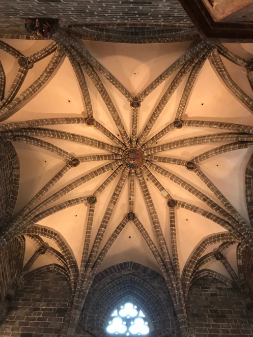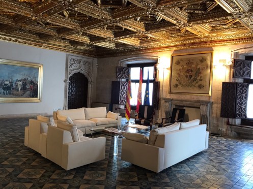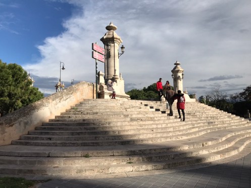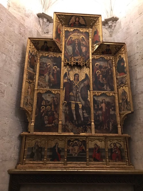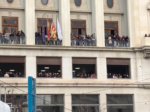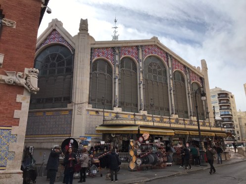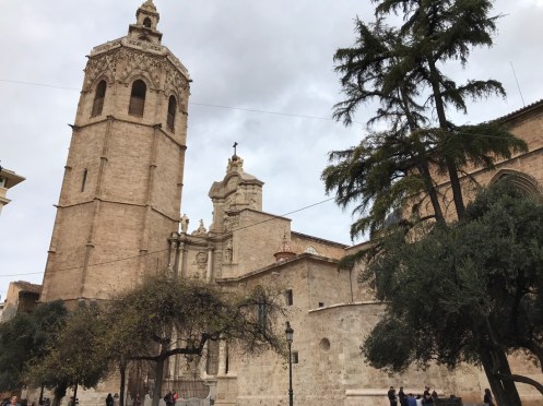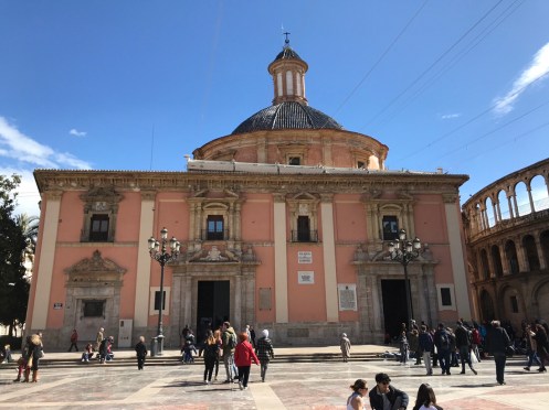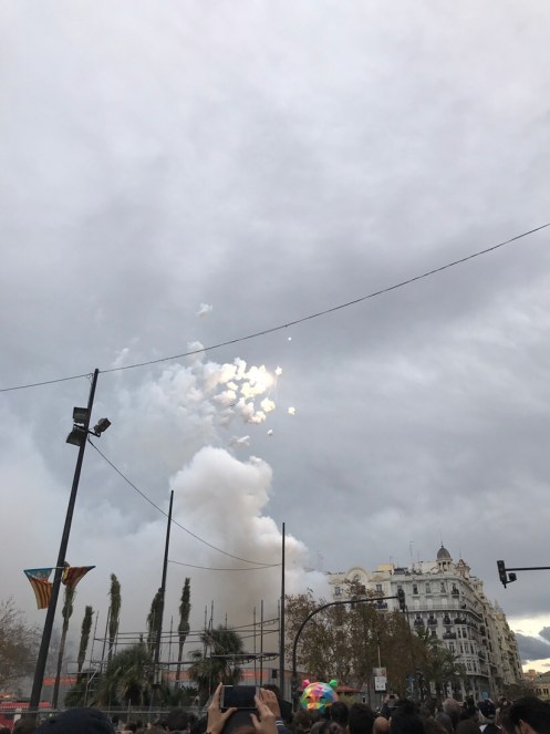 J’ai peut-être oublié de parler d’un détail, nous sommes à Valencia pour faire le Camino de Levante qui doit nous conduire à Saint-Jacques de Compostelle. Pas cette fois-ci car nous n’avons pas assez de temps, mais la prochaine fois lorsque nous reprendrons le chemin là où nous nous serons arrêtés. Je ne peux pas résister, c’est trop mignon !!!La Cathédrale Sainte-Marie que nous avons visitée. Très belle. Avec plein de chapelles. Basílica de la Virgen de los Desamparados. Je viens de refaire mon salon !!! Palau de la Generalitat. Mercat Central. Nous nous y trouvons un bar où nous mangeons des tapas. Au moment de payer la serveuse nous dit d’aller vite sur la place de l’Ayuntamiento pour assister à la « mascletá » qui va avoir lieu à 14 h. 13:52 la plaza del ayuntamiento est noire de monde. Sur tous les balcons il y a de la foule. 14 h ça commence. Des pétards fusent dans le ciel avec un bruit assourdissant. 6 mn plus tard, c’est fini. On ne voit plus les immeubles tellement qu’il y a de la fumée. J’ai la gorge serrée d’émotion !!! C’était impressionnant.