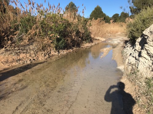Ça commence bien voilà de l’eau !!! Nous commençons par faire demi tour … mais il faut passer sinon c’est trop long !!! Nous revenons ça passe facilement sauf pour moi qui ne choisit pas le bon endroit. Résultat mes chaussures sont pleines de boue !!!