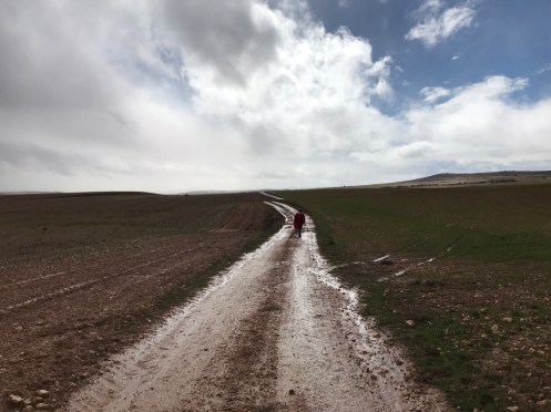 Oh miracle, la force du vent a enfin baissé !!! Nous ferons les 6 derniers kilomètres sans lutter. Mais le chemin est devenu boueux et les chaussures pèsent une tonne !!!