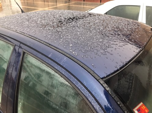 Nous nous arrêtons pour manger dans un petit bar et en sortant, oh surprise, il grêle !!!