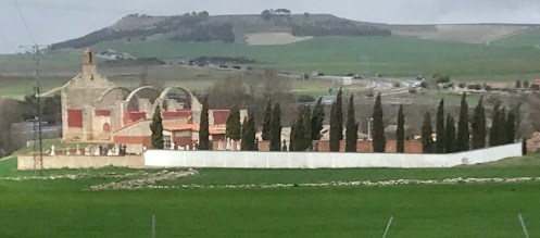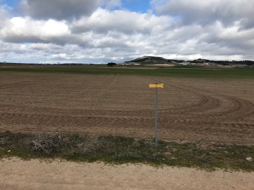 Là-bas, loin, loin, Mota del Marqués. 5 km de rafales de vent de côté. Nous marchons en crabe, le sac à dos nous emporte. Il ne pleut plus heureusement car le sol aurait collé à nos chaussures.