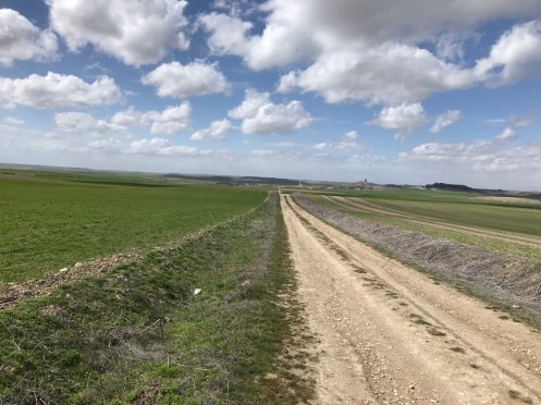 Là-bas, loin, loin, Mota del Marqués. 5 km de rafales de vent de côté. Nous marchons en crabe, le sac à dos nous emporte. Il ne pleut plus heureusement car le sol aurait collé à nos chaussures.