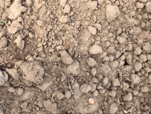 Le terrain est prêt pour les plantations. On voit bien les petits granulés d’engrais.