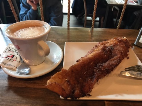 Et si nous allions boire un café ??? Le petit-déjeuner n’est pas loin, je ne pensais pas que la boisson, pour moi café au lait, était accompagnée par : croissant, churros … ici torrijas (pain perdu), le régime n’est toujours pas au programme. Et j’ai eu tout ça pour 1,70 € !!!