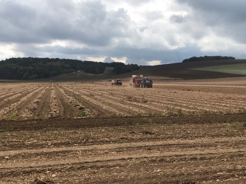 Le temps a changé, le beau soleil du matin a disparu. Ramassage des oignons. En même temps au bord du champ il y a des gens qui glanent.