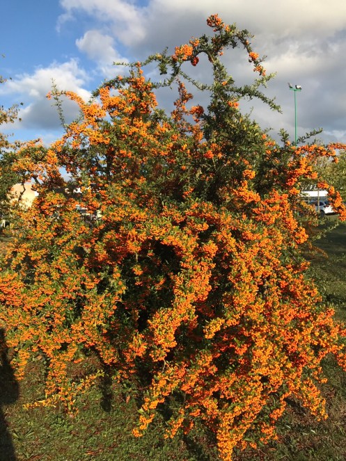 Ouf !!! Yves va pouvoir pédaler sans problème, pour moi ce sera plus difficile, j’avais déjà des difficultés à le suivre avec un vélo cassé alors maintenant ???Et pour terminer, un pyracantha. La visite de Verdun c’est pour demain. Nous avions retenu l’hôtel en zone commerciale afin d’être près de Décathlon pour la réparation.