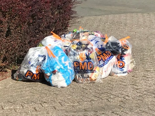 C’est le jour de ramassage du recyclable. Les sacs transparents sont intéressants comme ça on voit s’il n’y a pas n’importe quoi dans le sac. D’un autre côté chez nous avec les chats et les chiens errants ça risque d’être vite déchiré.