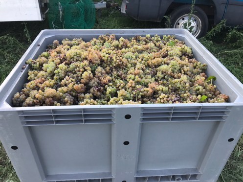 Ici aussi on vendange. Ce sont les premières vignes que nous voyons. À part la toute petite hier, sur le Mont St-Pierre.