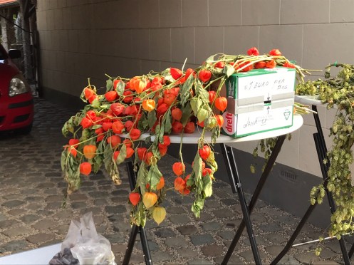 Partout il y’a des choses à vendre : pommes, tomates, courges .., avec à côté une tirelire pour mettre l’argent.