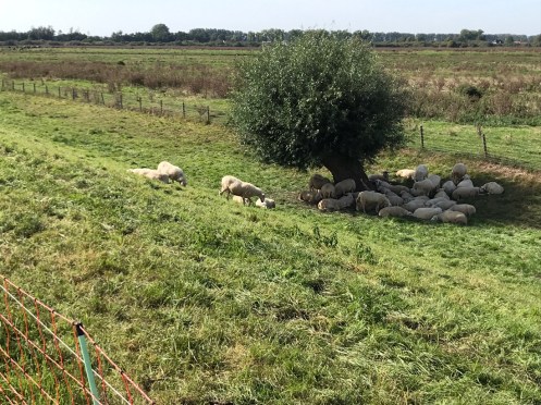 Tonte naturelle des digues par les moutons. Ils ont tellement à manger qu’on les voit partout affalés dans l’herbe.