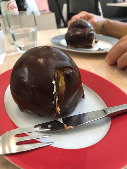 Avant de retourner à l’hôtel arrêt dans la meilleure pâtisserie de Den Bosch, Ian de Groot, pour manger la spécialité du coin, le Boosche Bol et fêter notre millième kilomètre !!! Un délice, rempli de crème fouettée et nappé de chocolat.