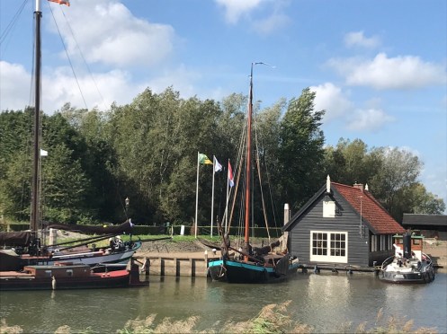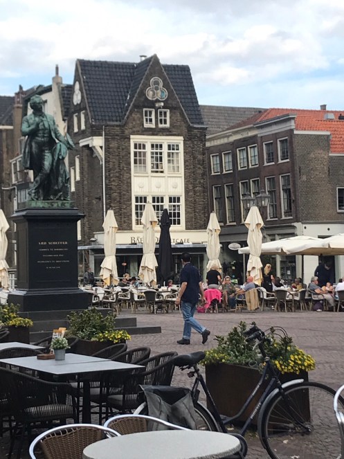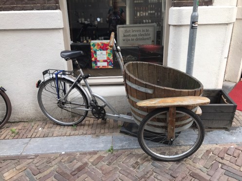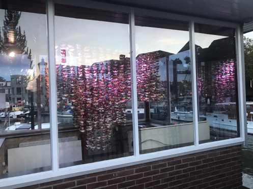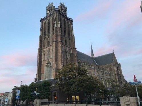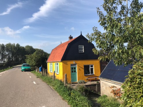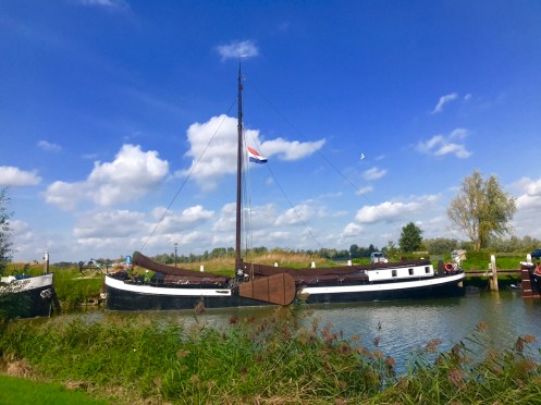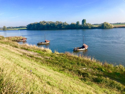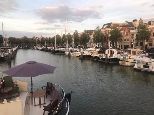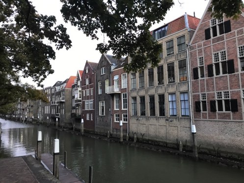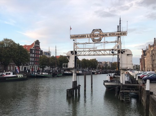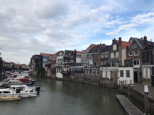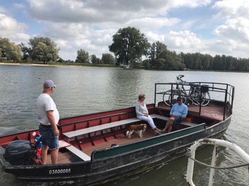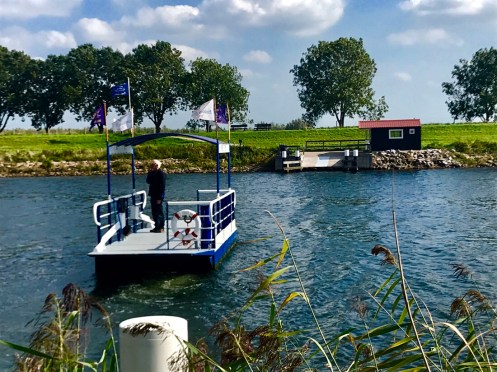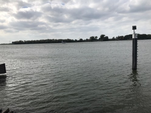Dernier passage de bac pour arriver à Dordrecht. Là c’est un gros bateau qui transportait 14 voitures et plein de vélos. On traverse la nouvelle Meuse, c’est ce qui est écrit sur Google. Nous nous perdons dans les noms. Il y a des canaux partout. On ne sait pas où est la Meuse.