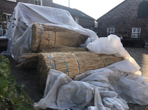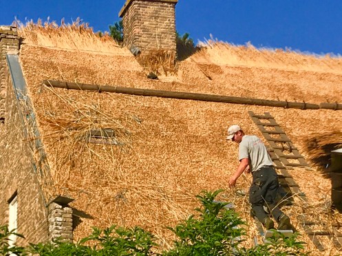 Arrêt devant une maison où ils étaient en train de refaire le toit de chaume.