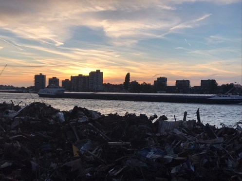 Au premier plan, une péniche remplie de ferraille.