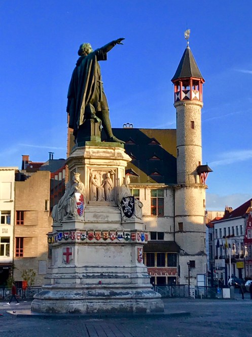 La fontaine de Brabo. Silvius Brabo est un légendaire soldat romain qui tua le géant Druon Antigone qui exigeait un droit de passage sur l’Escaut. Il lui trancha la main et la jeta dans le fleuve. Suivant cette explication le nom Antwerpen (néerlandais d’Anvers) viendrait de hand werpen (hand = la main, werpen = jeter, en néerlandais). Ceci dit, cette version est assez contestée, certains affirmant plutôt qu’Antwerpen viendrait de aan het werpen qui désigne la jetée du port.