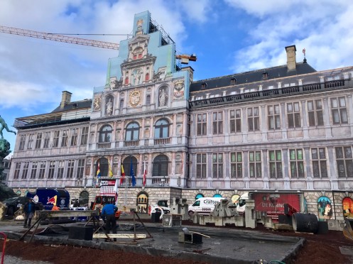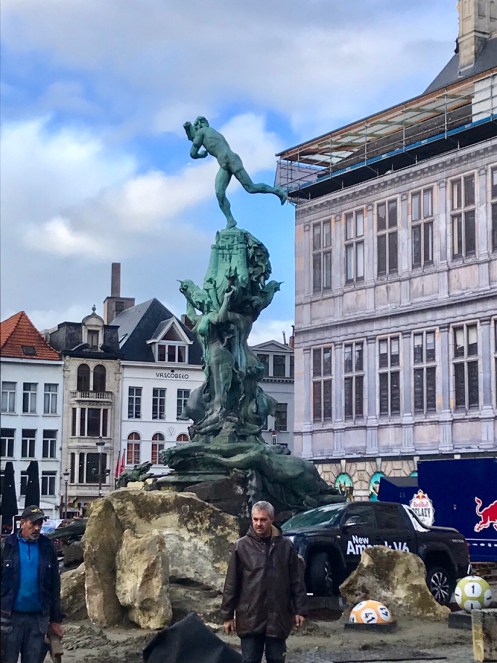 La fontaine de Brabo. Silvius Brabo est un légendaire soldat romain qui tua le géant Druon Antigone qui exigeait un droit de passage sur l’Escaut. Il lui trancha la main et la jeta dans le fleuve. Suivant cette explication le nom Antwerpen (néerlandais d’Anvers) viendrait de hand werpen (hand = la main, werpen = jeter, en néerlandais). Ceci dit, cette version est assez contestée, certains affirmant plutôt qu’Antwerpen viendrait de aan het werpen qui désigne la jetée du port.