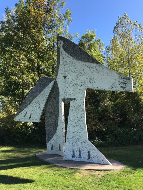 Jusqu’à Lille nous roulons au bord d’une nationale avec pratiquement tout le long, une bande matérialisée pour les cyclistes. Lille. Entrée par la porte de Gand. Visite du LaM, Musée d’art moderne, d’art contemporain et d’art brut à Villeneuve-d’Ascq. Picasso. Femme aux bras écartés 1962.