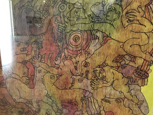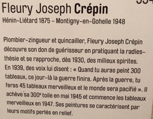 Nous sommes dans la partie art brut. L’art brut est le terme par lequel Jean Dubuffet désigne les productions de personnes exemptes de culture artistique. Un des tableaux de Crépin.
