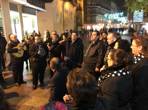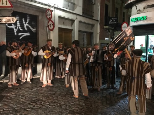 Une zambomba. Nous avions vu cet instrument sur l’orchestre des enfants que nous avons croisé vendredi. C’est une poterie recouverte de tissu avec une baguette au milieu. Le son se produit en frottant la baguette avec la main, baguette humidifiée continuellement avec le spray.
