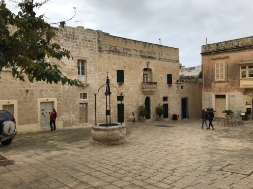 Il y avait deux endroits à visiter. D’un côté de la rue un musée explicatif et d’immenses catacombes. De l’autre côté de la rue, dans un grand parc 23 petites constructions comme celle, nous descendions et la visite était rapide. Les amandiers sont en avance par rapport à chez nous. Il y a déjà des fleurs et des amandes. Pour sortir des catacombes il fallait traverser la boutique de souvenirs où j’ai eu la bonne idée d’acheter deux capes de pluie. Mais voyons Aline, si tu avais une liste de choses à emporter en voyage, les tiennes ne seraient pas restées dans ton armoire à Vestric !!! Je disais donc que j’ai eu un éclair de génie car il s’est mis à pleuvoir à très fort… il avait déjà un peu bruiné lorsque nous visitions Mdina mais très vite le soleil était revenu.
