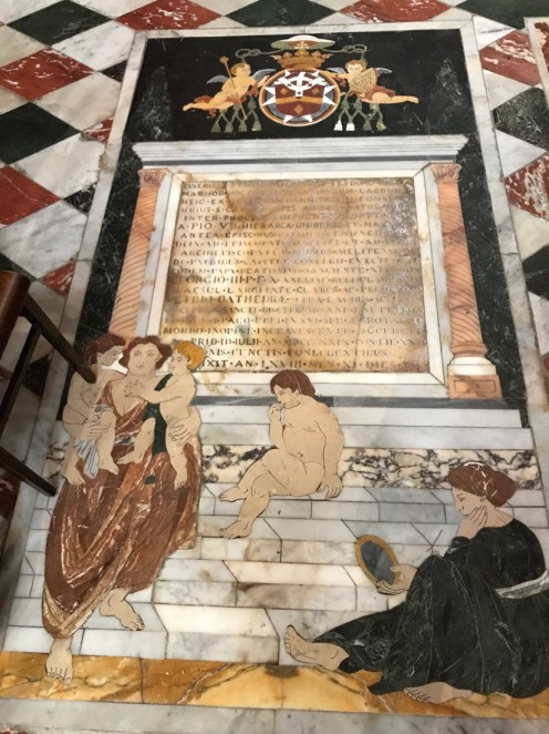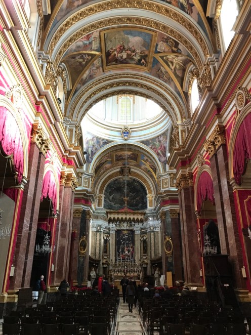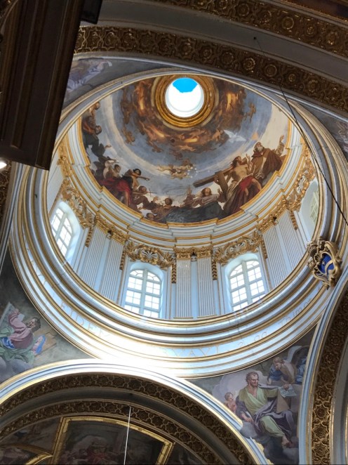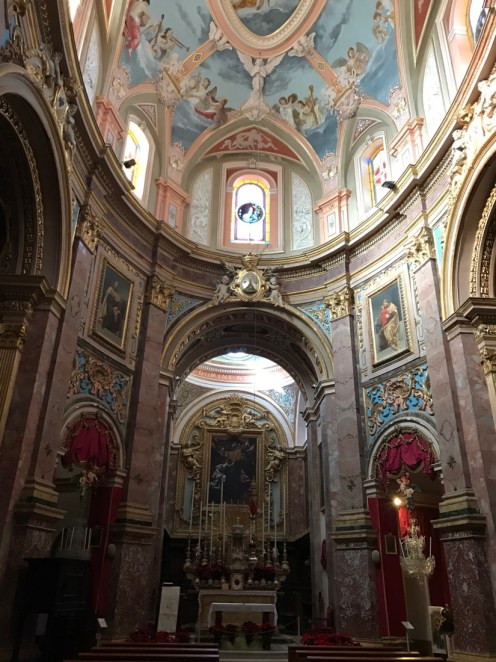 La Cathédrale St Paul. Le dôme. Détail de la crèche. Le sol est rempli de dalles en marbre polychrome dédiées à des évêques ou des prêtres. J’ai oublié de dire que c’est l’un des plus beaux exemples d’architecture baroque à Malte.