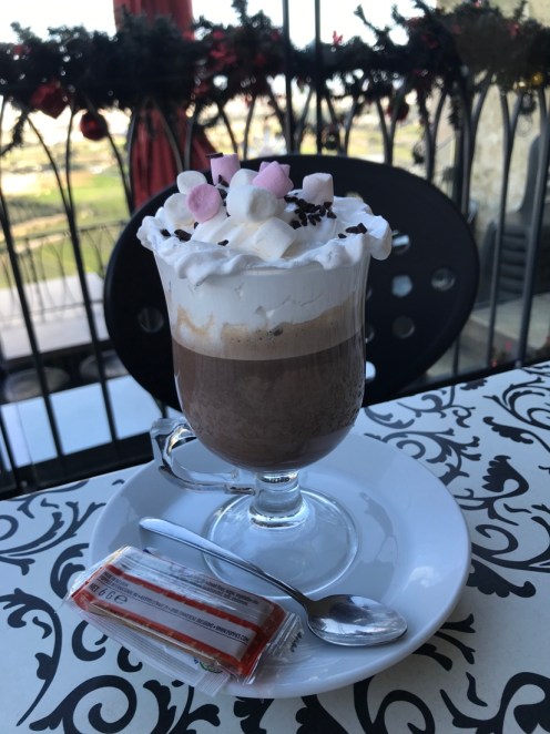 Vue sur la plaine et la mer. 10 h, il faut prendre des forces avant de continuer la visite. Je fais taire tout de suite les mauvaises langues : c’est le chocolat chaud pris par Yves !!! Moi, j’ai pris juste un café au lait, servi tout de même avec un pot de café et un petit pot de lait.